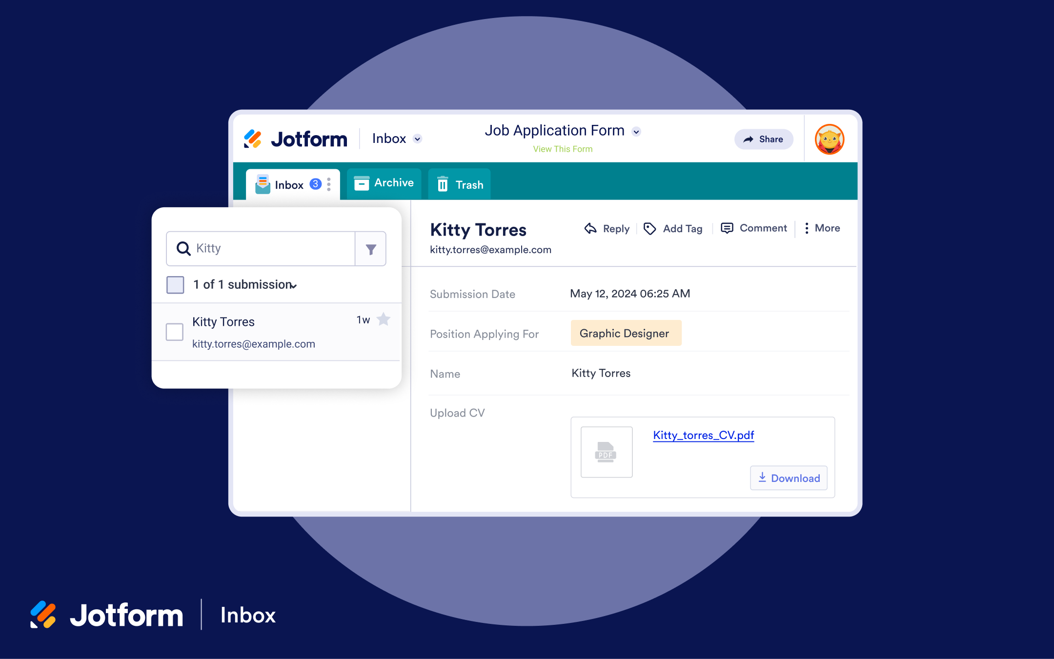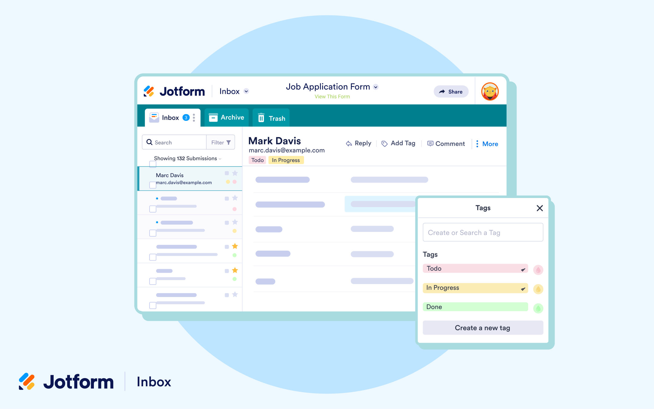 Jotform Inbox is a product Jotform users can use to track, search, and manage form submissions. Keep submissions organized, collaborate with team members, and find the exact information you’re searching for.