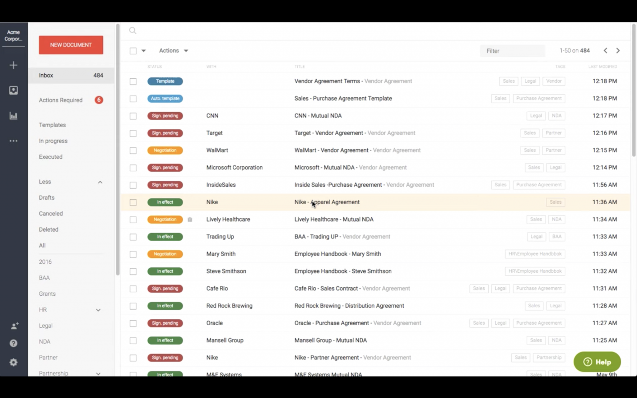 Concord is a contract management platform. Users can create, edit, review, send, and sign contracts and make their own templates to reuse when building sales documents. Other features include approval workflows with conditional actions, centralized cloud storage for all documents, user permissions, analytics reports, and advanced document searches.