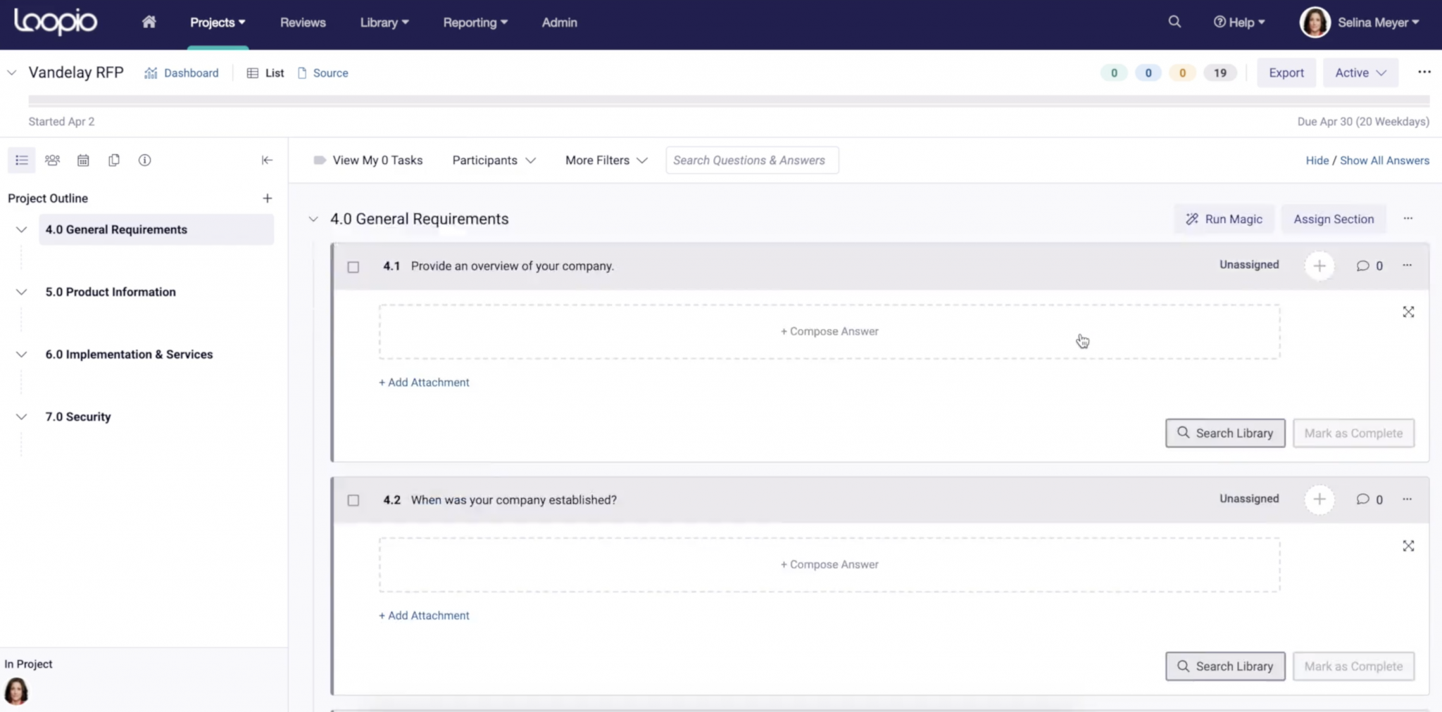 Loopio is an RFP response platform that lets you respond to RFPs, due diligence questionnaires, security questionnaires, and other requests for information.