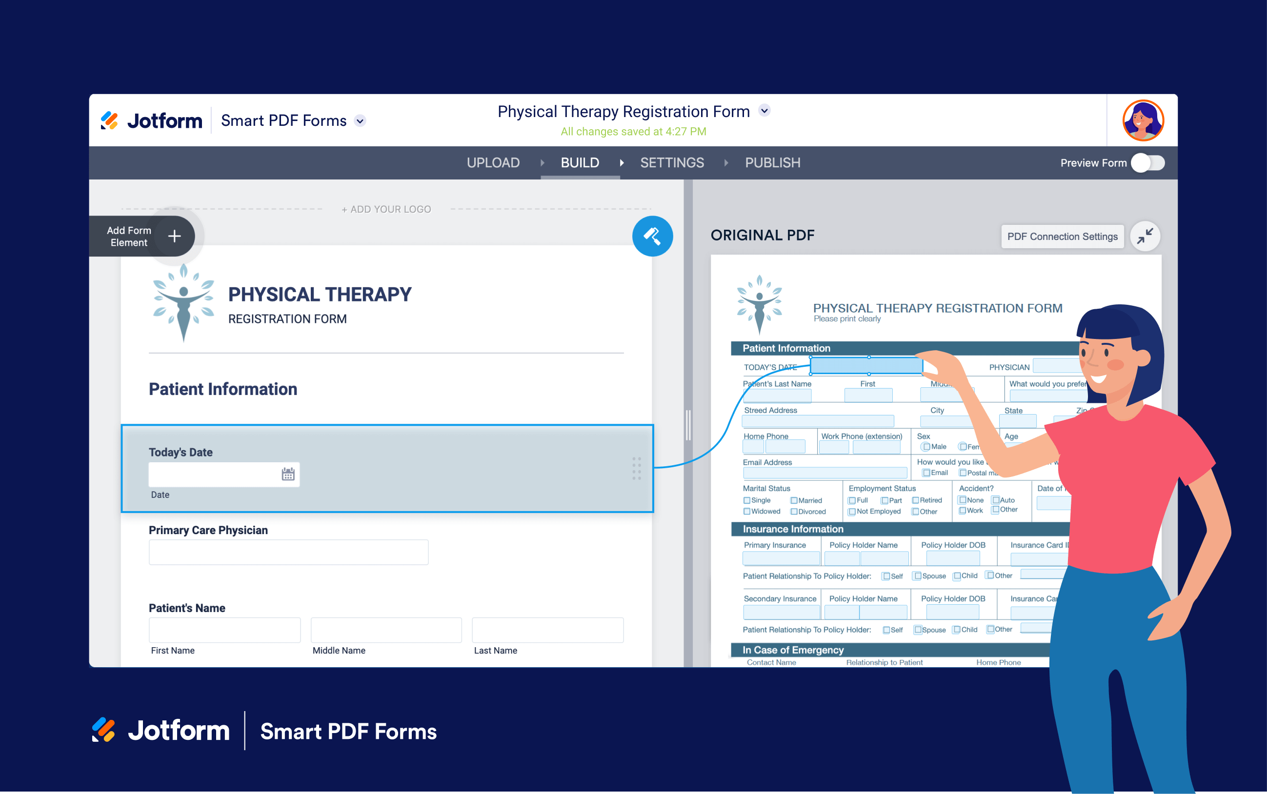 Connect your online form to PDF to make sure every information is on its right place. Add new fields to your PDF along with your online form. Drag and drop the PDF fields on suitable places on the PDF.